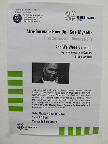 Das Goethe-Institut und das W.E.B Du Bois Center für Pan-Afrikanische Kultur veranstaltet nach der erfolgreichen Programmserie „Afro-Germans – Embracing Two Worlds“ im letzten Jahr (2007) in Zusammenarbeit mit dem SFD (Schwarze Filmschaffende in Deutschland), eine Filmreihe „Afro-Deutsch – Wie sehe ich mich?“