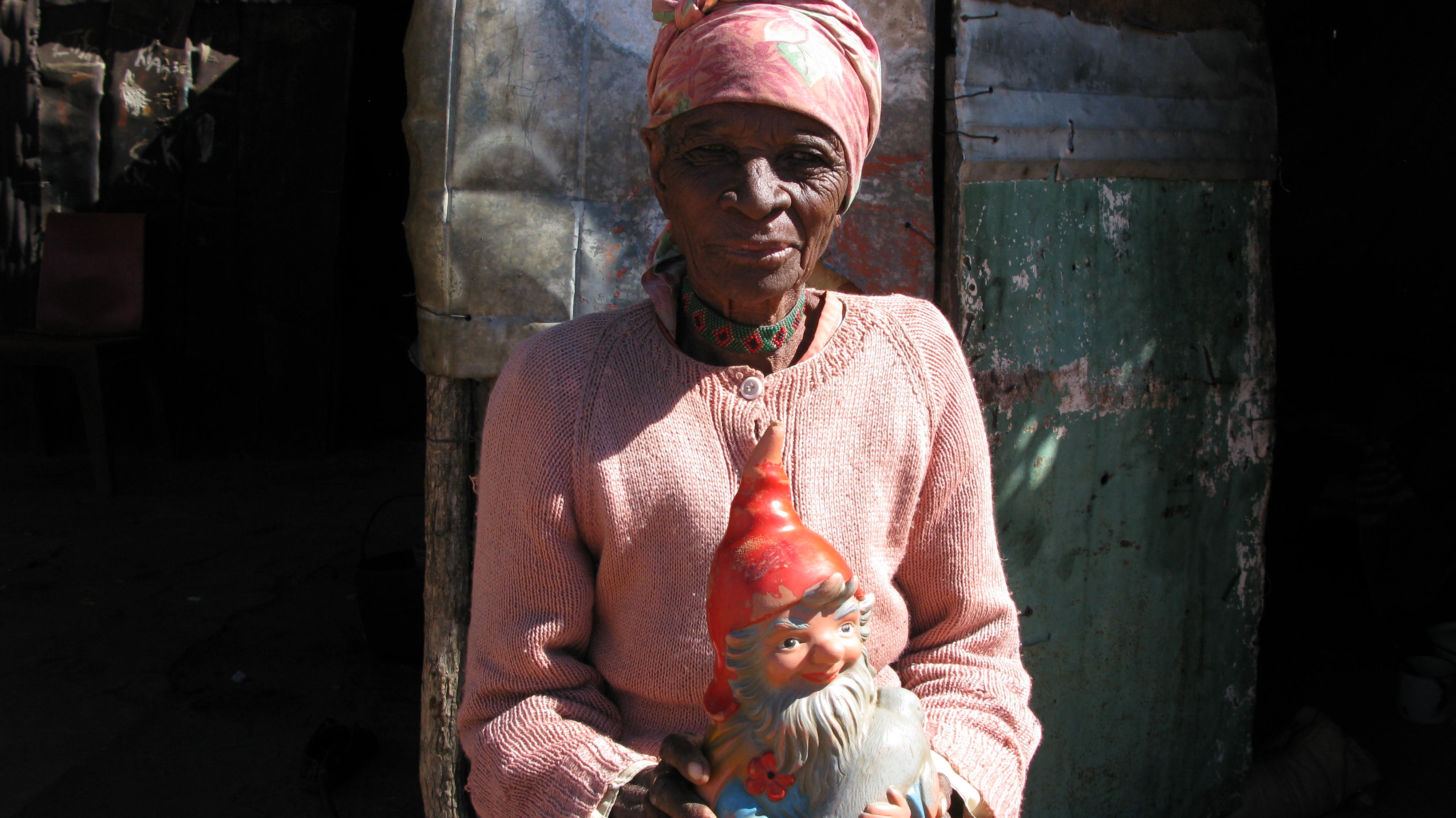 Foto: Oma Klaasen vor Hildegards Hütte. Früher lebte sie auf einer deutschen Farm in der Umgebung – der Gartenzwerg erinnert sie daran.
