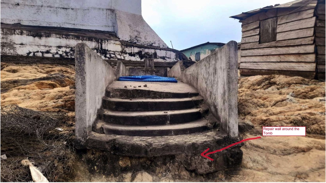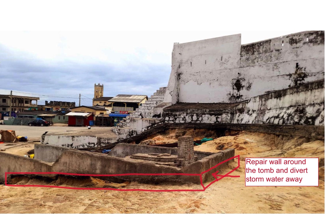 Anfang 2023 bekam ich die Nachricht, dass das Grab von Anton-Wilhelm Amo während der letzten Regenzeit schwer beschädigt wurde. Die Wassermassen hatten das ungeschützte Grab, dass 1927 vom alten niederländischen Friedhof prominent vor dem ehemaligen Sklavenfort Sao Sebastiao umgebettet wurde fast vollständig unterspült. Eine weitere Regenzeit würde das Grab nicht mehr überstehen. Zeit zu handeln! Ich habe daraufhin in Berlin zunächst die Anton-Wilhelm Amo Heritage Society e.V. und deren Vorstand Andrea Vicky Amankwaa-Birago kontaktiert. Ebenfalls mit von der Partie, Prof. Dr. Wolfgang Paul, ehemaliger Forschungsdirektor von Amos Almer Mater „Martin-Luther-Universität“ in Halle-Wittenberg. Prof. Paul und ich haben zusammen ein Konzept ausgearbeitet, um Gelder für die Grabrettung beim Auswärtigen Amt und der Deutschen Botschaft in Accra, Ghana zu beantragen. Aber ohne fachkundige und tatkräftige Unterstützung vor Ort gelingt so ein Projekt nicht. Diese Unterstützung haben wir durch Rosemary Orthner von Orthner Orthner & Associates in Accra gefunden. // At the beginning of 2023, I received the news that the grave of Anton-Wilhelm Amo had been severely damaged during the last rainy season. The masses of water had almost completely undermined the unprotected grave, which was moved in 1927 from the old Dutch cemetery in front of the former slave fort Sao Sebastiao. The tomb would not survive another rainy season. Time to act! In Berlin, I contacted the Anton-Wilhelm Amo Heritage Society e.V. and its director Andrea Vicky Amankwaa-Birago. Also involved, Prof. Dr. Wolfgang Paul, former research director of Amos Almer Mater „Martin Luther University“ in Halle-Wittenberg. Prof. Paul and I worked out a concept together, to apply for funds for the grave boarding at the German Foreign Office and the German Embassy in Accra, Ghana. But such a project cannot succeed without expert and active support on the ground. We found this support through Rosemary Orthner of Orthner Orthner & Associates in Accra.